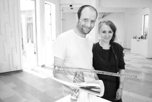 Laurence Brabant is a French glass studio helmed by Laurence, designer, and partner Alain, glassblower. Their intention is to produce unpretentious discreet designs through sophisticated, functional, simple objects. All of Laurence Brabant Editions are handmade, mouth-blown in their studio. No molds or modifications are used, and each unique piece is made in one go which requires seasoned skill and concentration. Borosilicate glass was chosen as a material, for it enabled Laurence to produce designs that were otherwise limited by pipe blowing. It also produced thin, light glass pieces that were heat-resistant and deceivingly durable. Laurence liked the contrast between the visible fragility and durability.