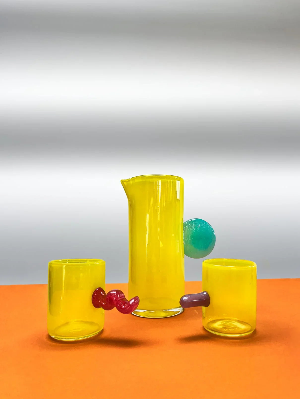 Introducing the Lemon Squiggle Set - the fullness embodiment of our bright Lemon colorway and the most dopamine inducing glass collection you'll ever sip from! Each cup is handmade with love by the incredibly talented glassblower Grace Whiteside of Sticky Glass in Brooklyn, New York.
