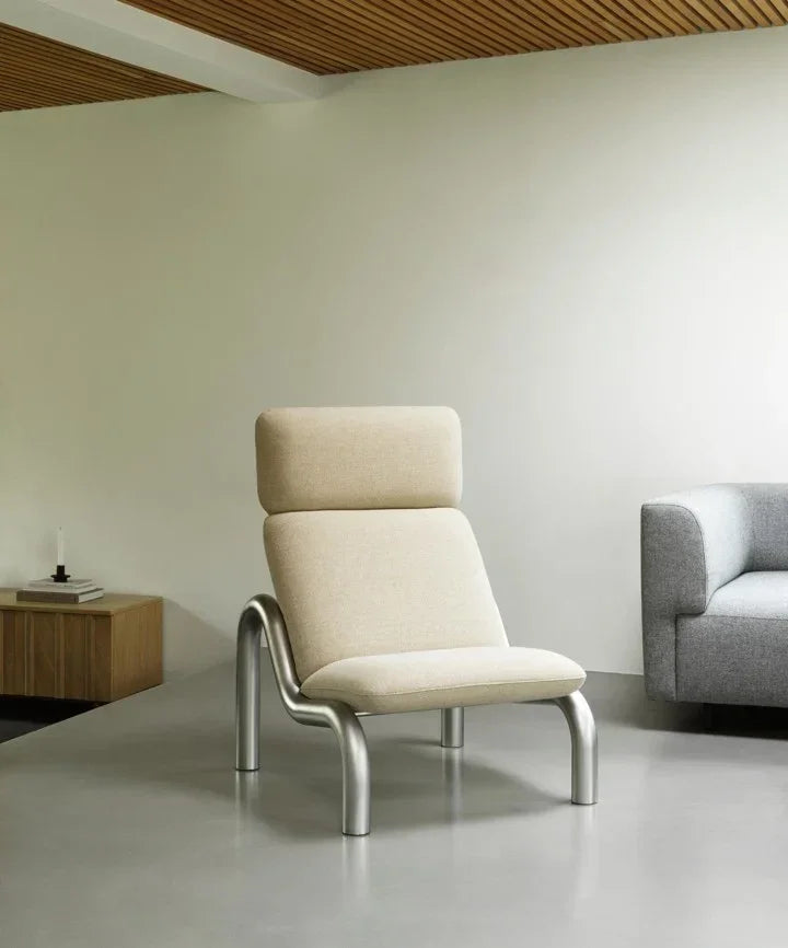 At the heart of the design lies the captivating interplay between soft and solid elements. Two over dimensioned glass blasted steel tubes form the distinctive frame of the chair, elegantly bending to follow the organic curvature of the generously padded seat. The extended backrest offers the ability to sit back and rest your head, while building on the visual experience of a comfortably padded seat designed for complete relaxation. This architectural framework prioritizes comfort without compromising on aesthetics. Inside, a plywood frame enveloped in layers of foam and wadding promises durability and comfort, while the upholstery offers a multitude of possibilities for personal expression within a diverse range of premium leather or textile options.
