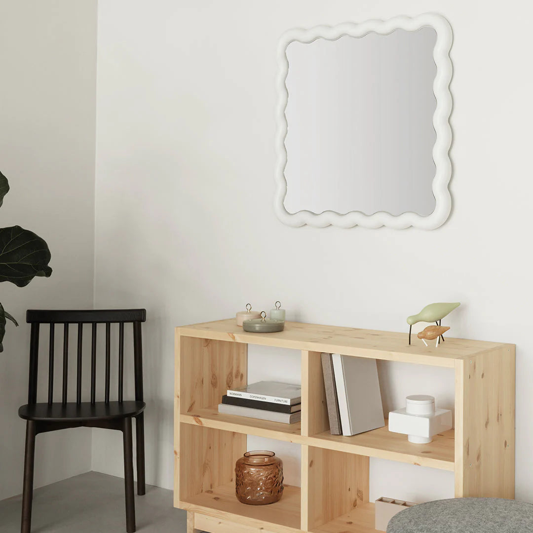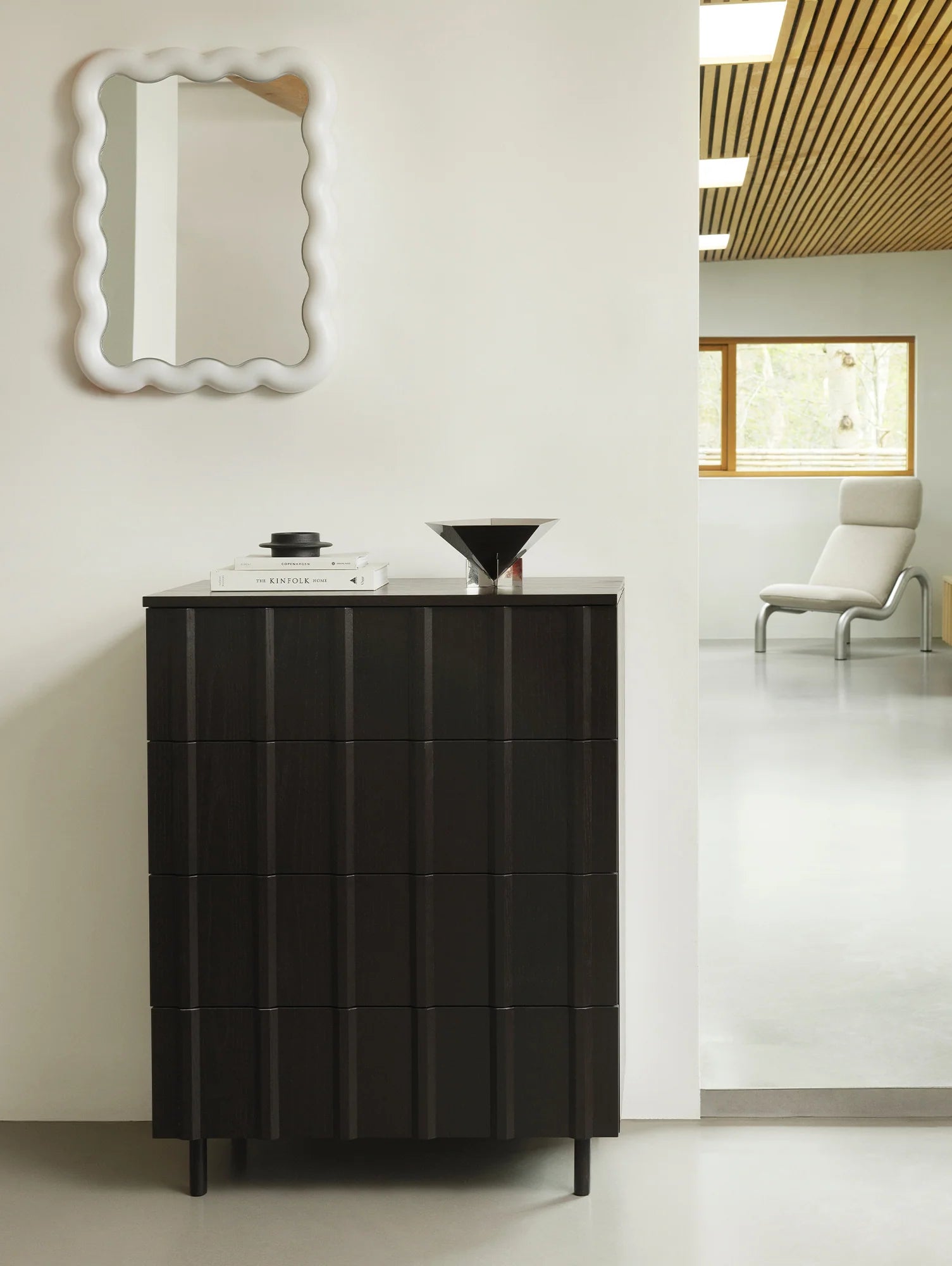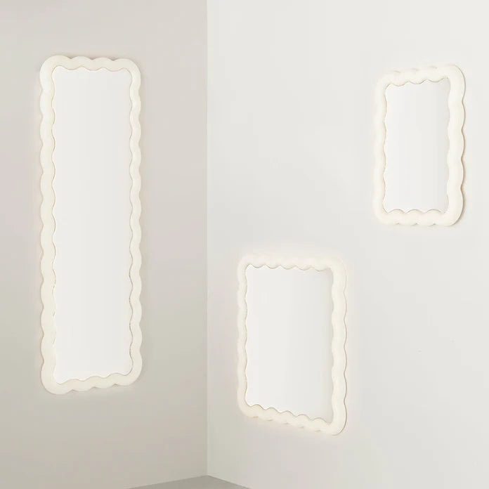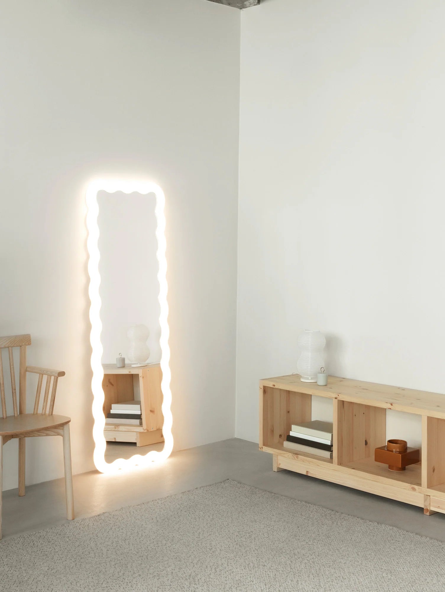 Illu is a stunning mirror distinguished by its unique, wavy frame and built-in dimmable LED light. An eye-catching design, that combines both decorative and functional elements, making it an ehancing addition to any room in the home. Illu presents an unconventional mirror with a playful expression and an intriguing frame that illuminates the mirror itself, adding character and finesse to the design. The winding frame is designed with a specific thickness to make room for the integrated lighting, ensuring the right ambiance. When lit, the frame becomes an illumination, presenting a distinct character that enchantingly transforms the mirror.