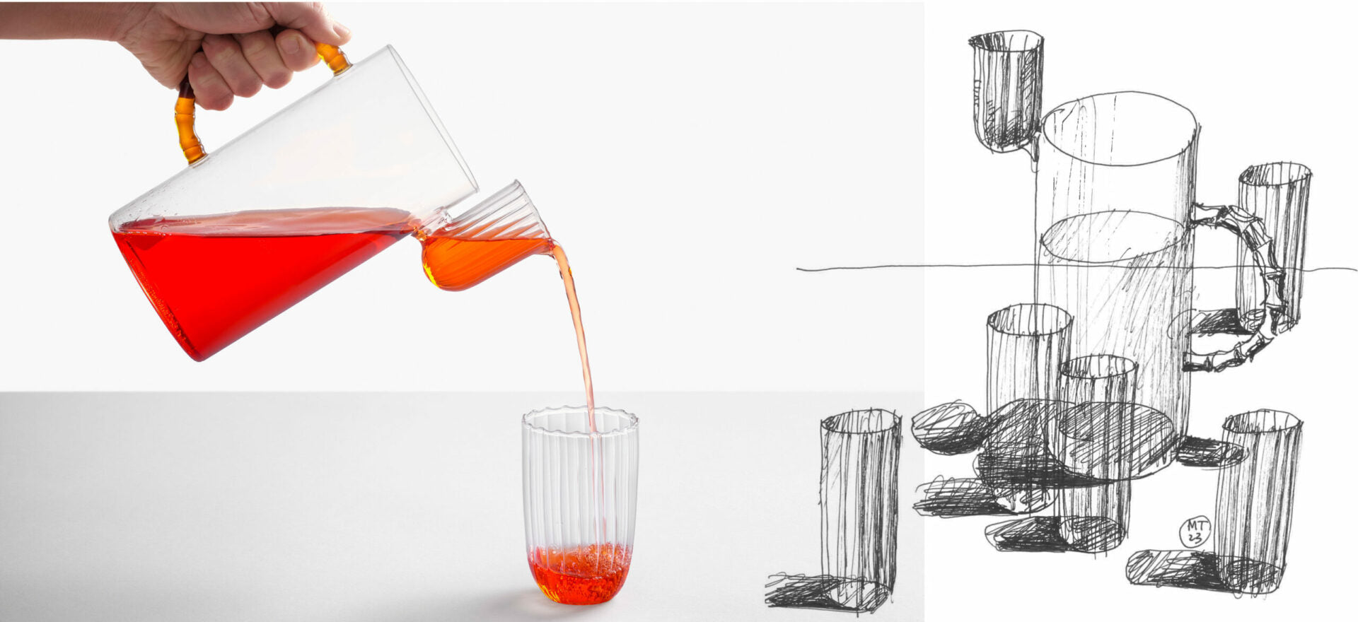 The Rivoli collection looks into the tenderness of the action of pouring water; with the carafe, the tiny glass on top invites you to pour with meticulous and deliberate motion, so not a single drop gets wasted; the exact gradualness in the angle is inevitably stylish and quietly invites the liquid's thousand rivulets to come out. Rivoli is a show of appreciation for water, just like the monk who joins their palms in the form of a cup to provide a small child a refreshing drink.