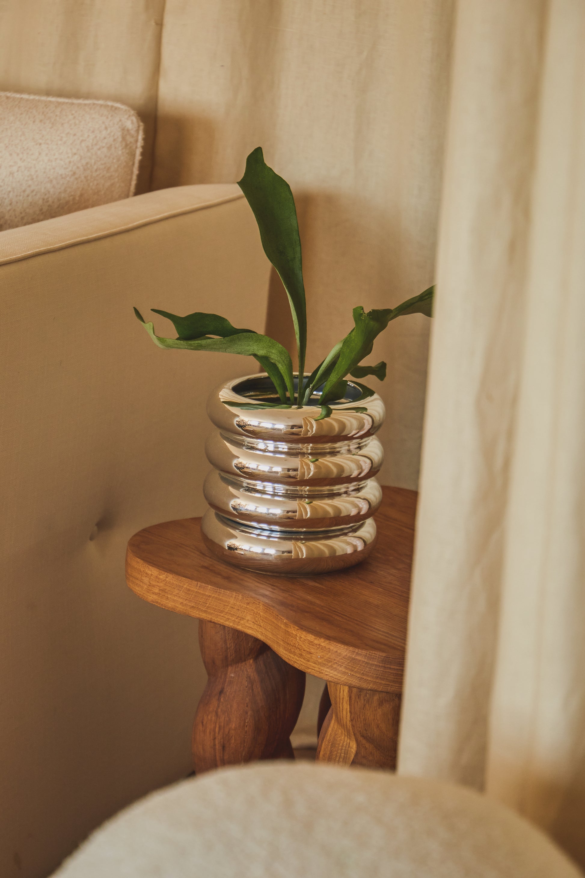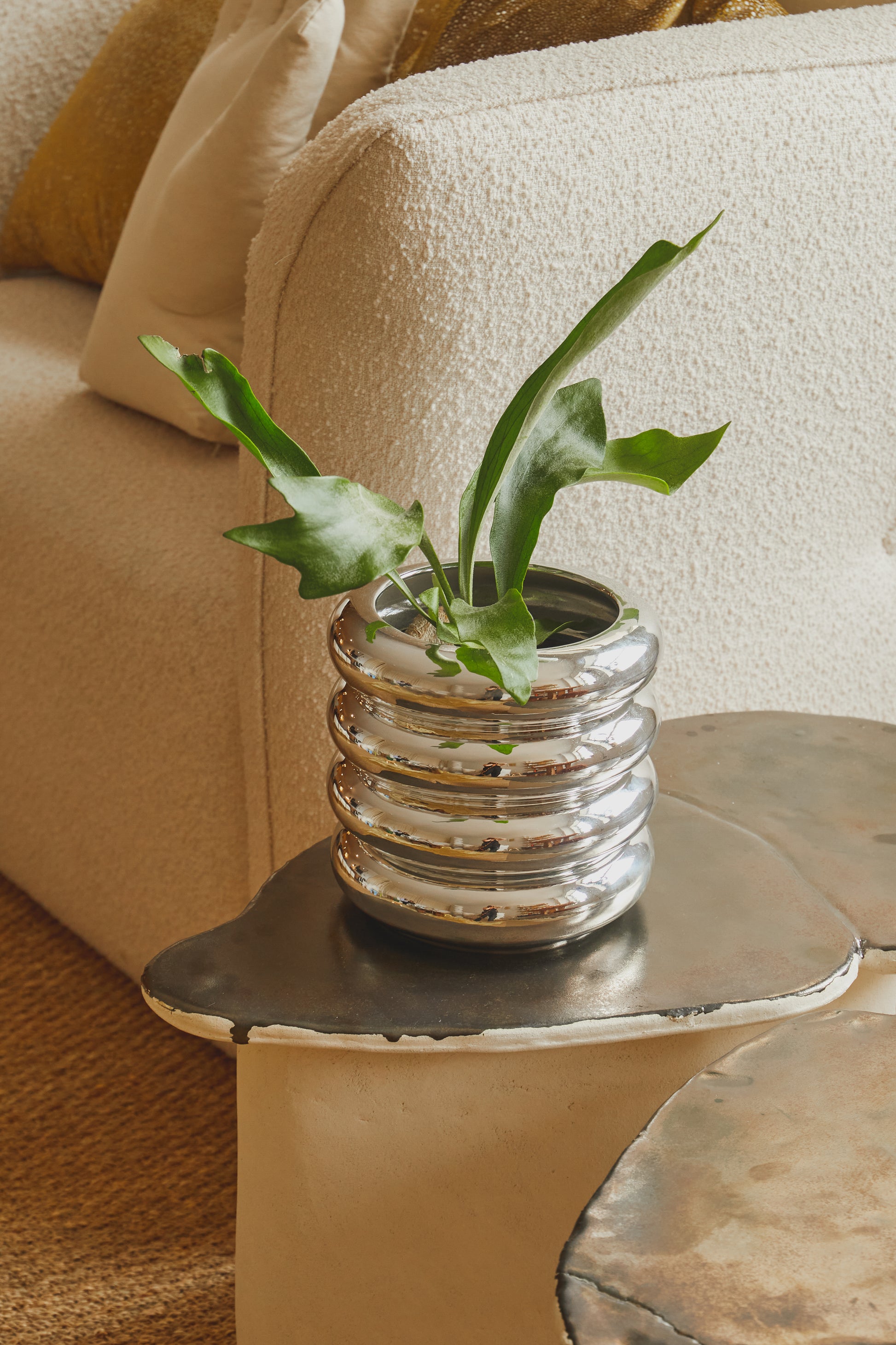 La jardinière empilable intègre discrètement à la fois une jardinière et une soucoupe en une seule forme. Soulevez l'anneau inférieur pour révéler une soucoupe cachée. La forme circulaire en grès s'inspire des isolateurs en céramique haute tension que l'on trouve sur les lignes électriques.