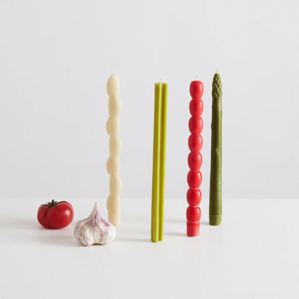Raid the garden without leaving your dining room. These jovial vegetable-shaped candles- complete with celery stalks, asparagus spears, garlic bulbs, and cherry tomatoes- are almost too convincing to resist. Crafted from unscented wax, they're pure visual mischief that transforms your table into a farmer's market display. A playful way to bring farm-fresh charm to your soirée, minus the actual vegetables.